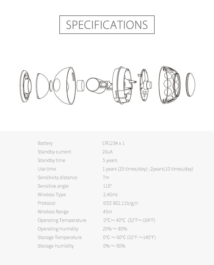 WiFi NEW PIR Motion Sensor Measure the light sensitivityBattery: CR123A x 1Standby time:2 yearsSensitivity distance:7mSensitive angle: 110°Standby current:13uAWireless Type:2.4GHzProtocol:IEEE 802.11b/g/nWifi... Read more